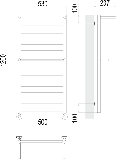 Комплектация: полотенцесушитель, уголок со сгоном 3/4х1/2 Г/Ш (2 шт.), эксцентрик (2 шт.), отражатель (2 штуки), крепеж.