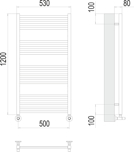 Комплектация: полотенцесушитель, вентиль угловой квадратный 3/4x1/2 ГШ (2 шт.), эксцентрик (2 шт.), отражатель (2 шт.), крепеж.
