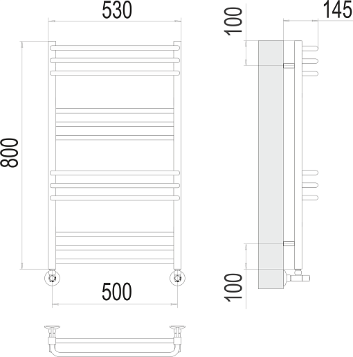 Комплектация: полотенцесушитель, вентиль угловой квадратный 3/4x1/2 ГШ (2 шт.), эксцентрик (2 шт.), отражатель (2 шт.), крепеж.