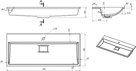 - Отверстие под смеситель: 1 по центру, 35 мм.