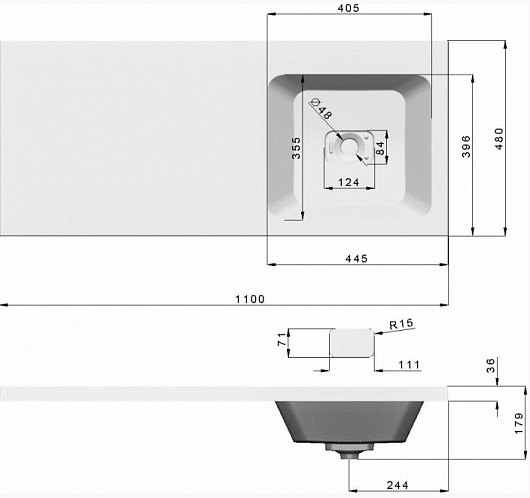 - Одно отверстие под смеситель по центру чаши. Подходит к стиральным машинам глубиной до 470 мм.