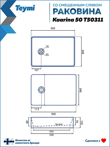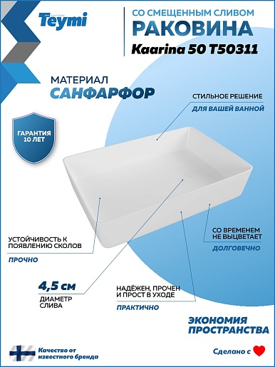 Teymi Раковина накладная Kaarina 50 T50311 со смещенным сливом белая