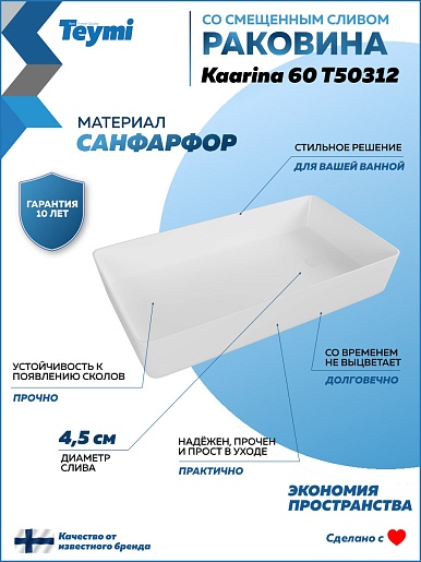Teymi Раковина накладная Kaarina 60 T50312 со смещенным сливом белая
