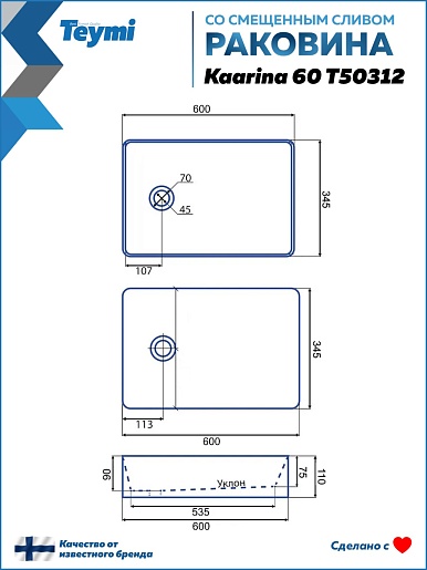 Накладная раковина Teymi Kaarina 60 T50312 белая - арт. T50312.