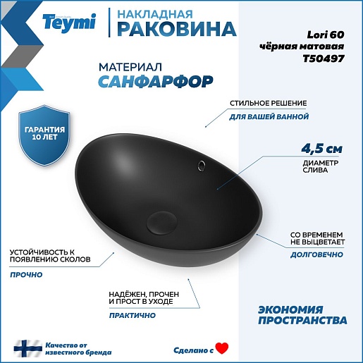 Накладная раковина Teymi Lori 60 T50497 черный матовый - арт. T50497.