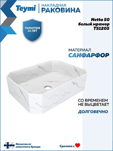 Накладная раковина Teymi Netta 50 T51205 белый мрамор - арт. T51205.