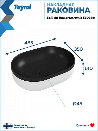 Teymi Раковина накладная в ванную Solli 48 Duo artceramic чёрно-белая матовая T50388