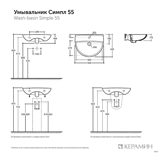 Керамин Раковина подвесная/на пьедестал Симпл 55 4810531137634