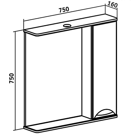 Описание: Зеркало с козырьком и нижней полкой, закрытое отделение сбоку (справа), петли со встроенным доводчиком. Один светильник, трансформатор мощностью 60 Вт, розетка с выключателем.