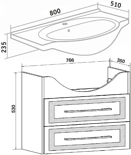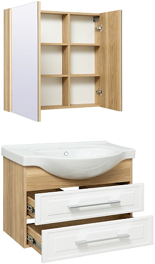 В комплекте: тумба, раковина, зеркальный шкаф, крепеж.