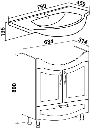 В комплекте: тумба, раковина, зеркальный шкаф, ножка (4 шт.).