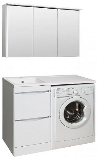 Комплект предусматривает установку стиральной машины под крылом умывальника справа от тумбы.