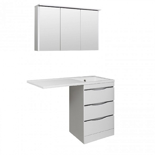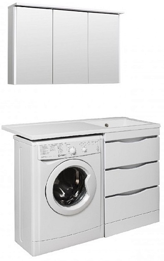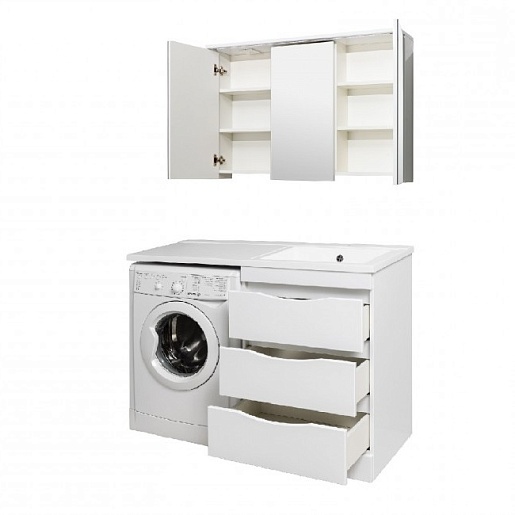Комплект предусматривает установку стиральной машины под крылом умывальника слева от тумбы.