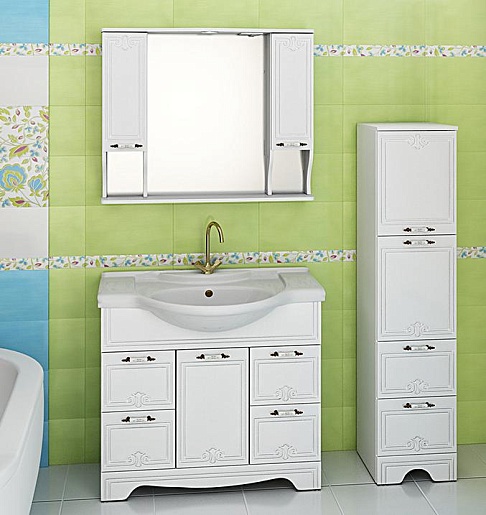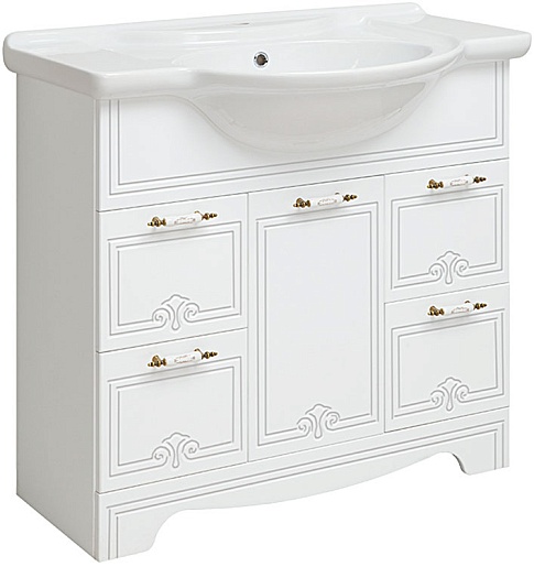 Описание: петли со встроенным доводчиком, 4 ящика на шариковых направляющих скрытого монтажа с доводчиком, ножки пластик — 4шт, ручки — 5шт. Комплектация: Умывальник «Дрея 85»