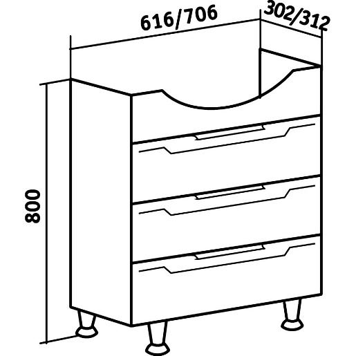 - Тумба под раковину Верона 65: на ножках с тремя выдвижными ящиками.Ножки хром — 2шт, ножки пластик — 2шт.