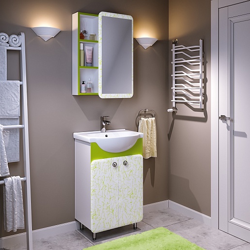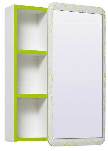 Описание: Зеркальный шкаф без подсветки с одной распашной дверкой и открытыми полками (слева или справа, зависит от установки). Внутри шкафа две внутренние полки. Петли со встроенным доводчиком.