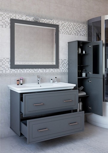 - Тумба под раковину Модена 105: выдвижные фасады, доводчики, фурнитура-состаренное серебро