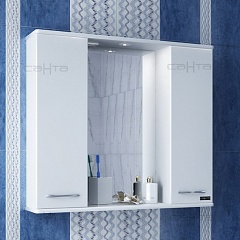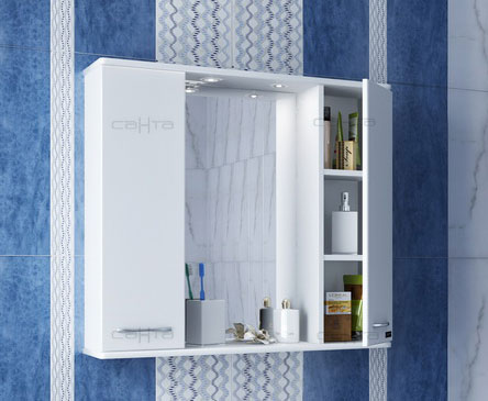Описание: влагостойкое зеркальное полотно, два шкафчика с распашными дверцами, полочки, встроенная подсветка с выключателем и розеткой.