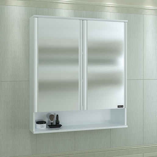Описание: корпус изделий выполнен из влагостойкого ЛДСП, фасад из влагостойкого ЛДСП с закрепленными на нём зеркальными полотнами, открытая полка.