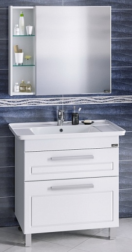 Описание: корпус изделий выполнен из влагостойкого ЛДСП, фасад из влагостойкого ЛДСП с закрепленными на нём зеркальными полотнами, открытые полки.