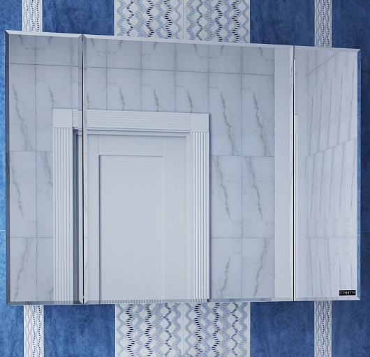 Описание: влагостойкое зеркальное полотно с фацетом, три распашных дверцы, вкладные полки. Фасад покрыт пленкой.