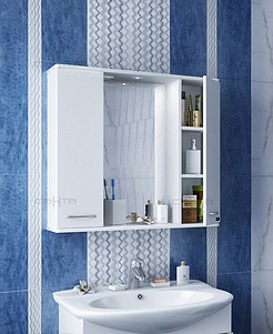 Описание: влагостойкое зеркальное полотно, два шкафчика с распашными дверцами, полочки, встроенная подсветка с выключателем и розеткой.