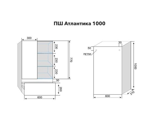 Описание: Подвесной шкаф для ванной с распашными дверцами и внутренними полками, ящиком, с механизмом доводчика.