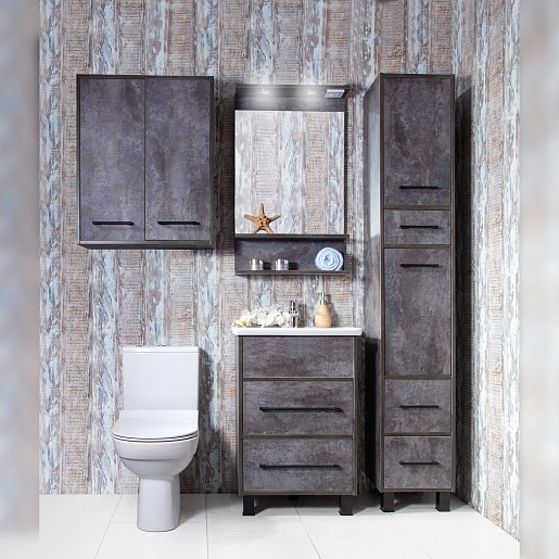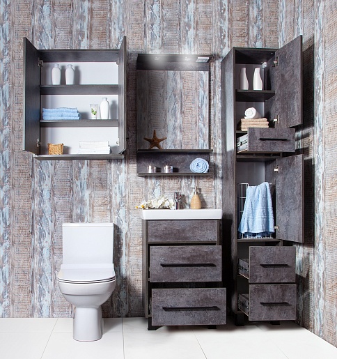 Описание: Подвесной шкаф для ванной с распашными дверцами и внутренними полками. Длинные металлические ручки.