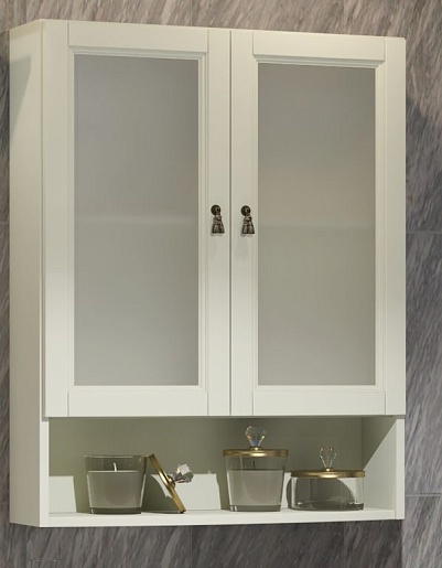 Описание: подвесной шкаф для ванной с открытой нишей и двумя застекленными распашными фасадами. Внутреннее пространство оборудовано полкой.