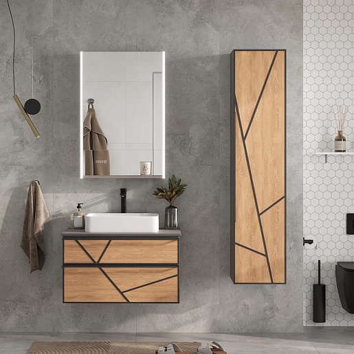 - В фасад пенал интегрирован декоративный черный металлический элемент, который так же выполняют функцию металлической ручки.