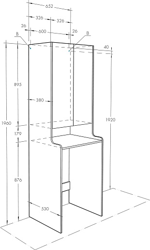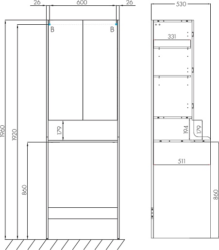 - 2 распашные дверцы, 1 открытая полка, ниша для установки стиральной машины.