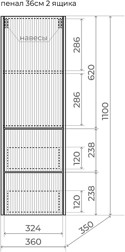 - 1 дверца, 2 выдвижных ящика.