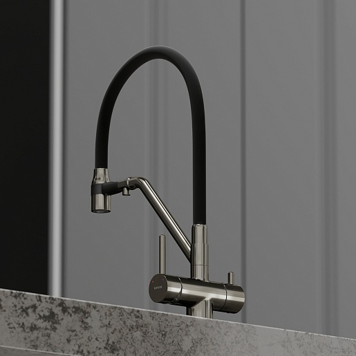 - Гибкий излив более маневренный, чем обычный, и позволяет настроить высоту и угол излива под любые нужды.