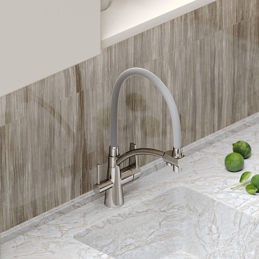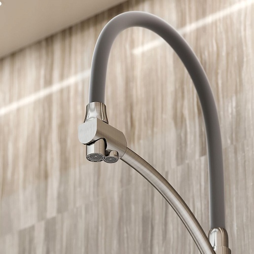 - Гибкий излив более маневренный, чем обычный, и позволяет настроить высоту и угол излива под любые нужды.