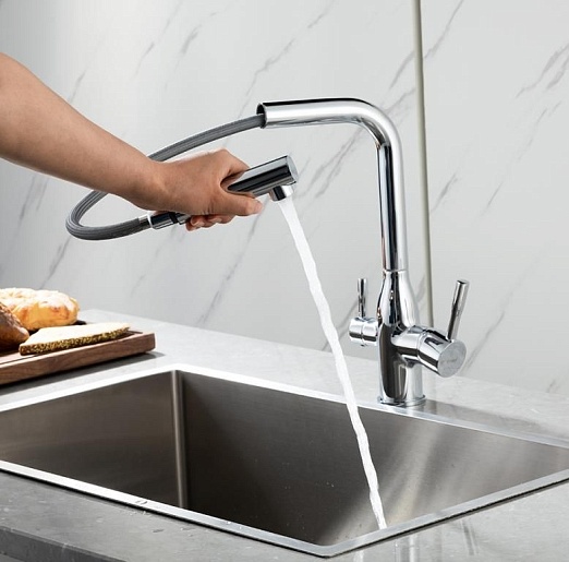 - Смеситель с выдвижным изливом удобен для мытья крупной посуды, мойки и наполнения емкостей.