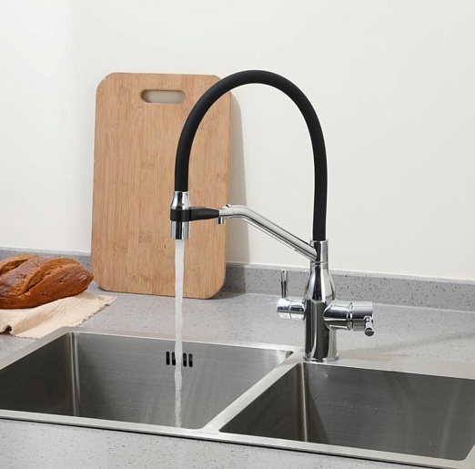 - Гибкий излив более маневренный, чем обычный, и позволяет настроить высоту и угол излива под любые нужды.