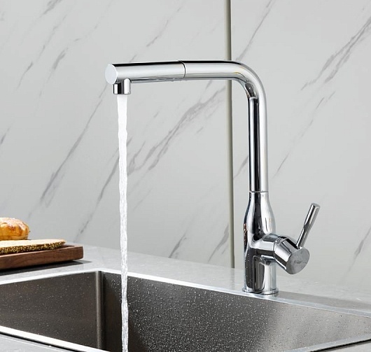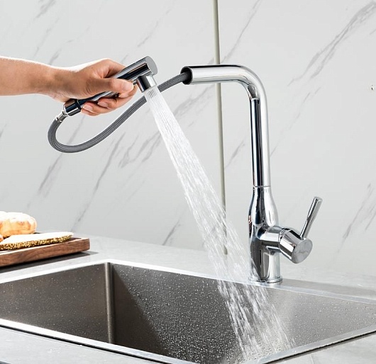 - Смеситель с выдвижным изливом удобен для мытья крупной посуды, мойки и наполнения емкостей.