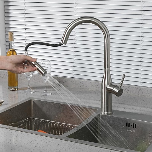 - Смеситель с выдвижным изливом удобен для мытья крупной посуды, мойки и наполнения емкостей.