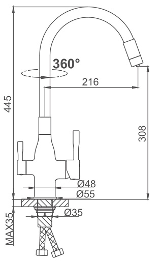 - Подача питьевой воды: через совмещенный излив.