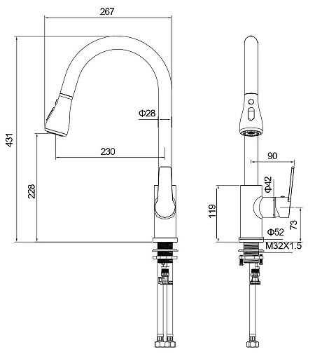 - Смеситель с выдвижным изливом.