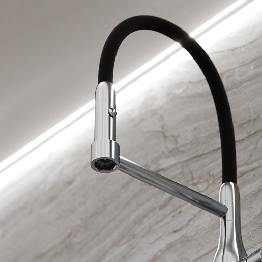 - Гибкий излив более маневренный, чем обычный, и позволяет настроить высоту и угол излива под любые нужды.