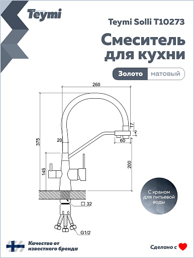 Смеситель для кухни Teymi Solli T10273 золото матовое - арт. T10273.