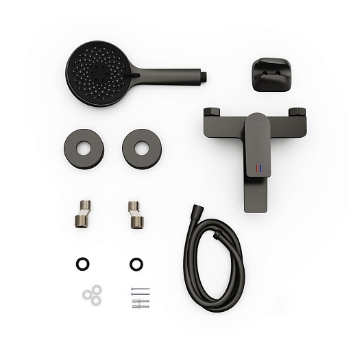 - В комплект входят эксцентрики из нержавеющей стали, PVC шланг (1,5 м), отражатели, душевая лейка 3 режима, держатель лейки.