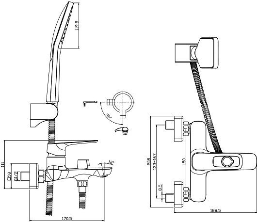 В комплекте: смеситель, душевая лейка, душевой шланг, держатель лейки, комплект эксцентриков с отражателями.