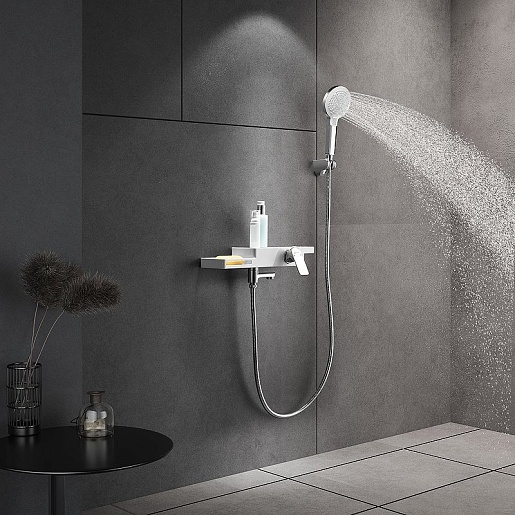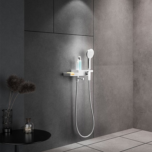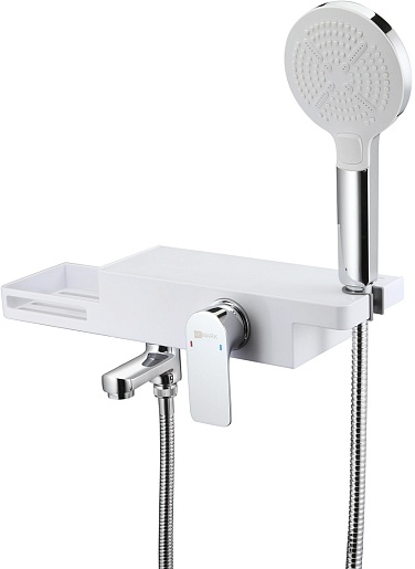 - Корпус смесителя выполнен в виде полочки для ванных принадлежностей.