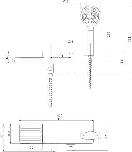 Комплектация: смеситель, душевая лейка, душевой шланг, держатель лейки, комплект эксцентриков.