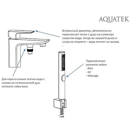 - Встроенный девиатор автоматически переключает поток с душа на излив при закрытии воды.