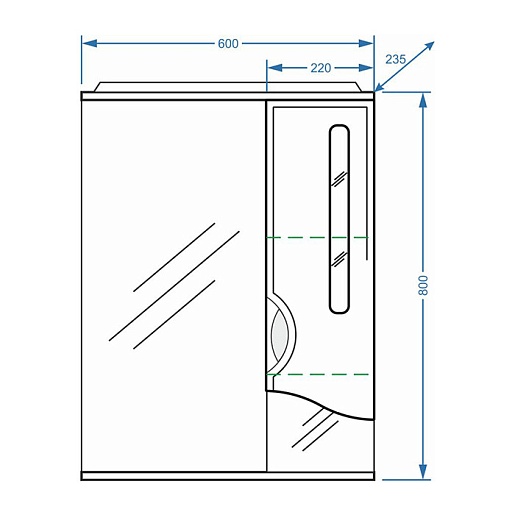 Описание: влагостойкое зеркальное полотно, шкафчики, полки, подсветка.