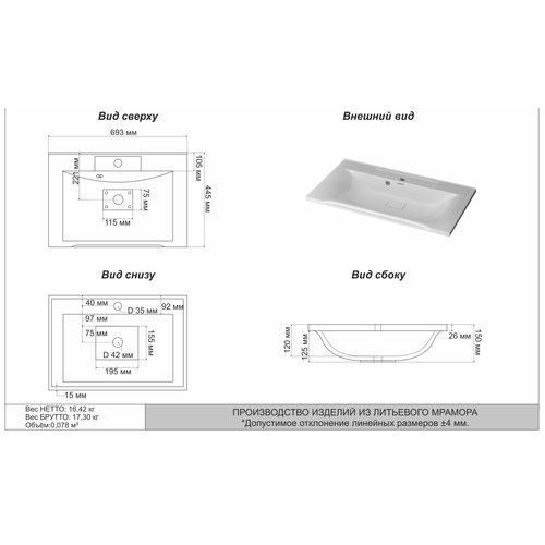 Stella Polare Тумба с раковиной Рианна 70, 2 двери