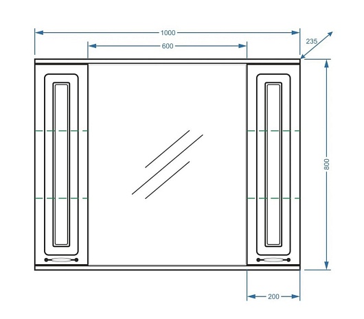 Описание: влагостойкое зеркальное полотно, полочки, шкафчики, подсветка.